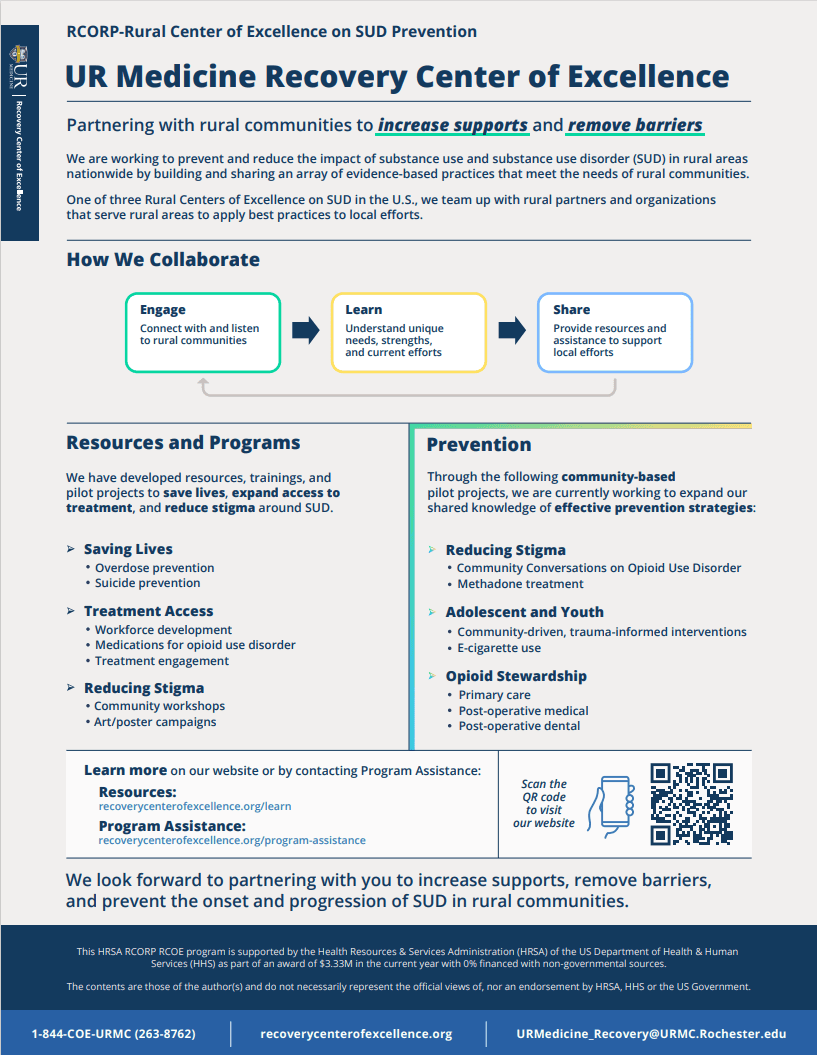 As the Rural Communities Opioid Response Program (RCORP)-Rural Center of Excellence on SUD Prevention, UR Medicine Recovery Center of Excellence provides access to a wide range of resources on relevant topics. Inclusion in this document does not imply endorsement of, or agreement with, the contents by UR Medicine Recovery Center of Excellence or HRSA.